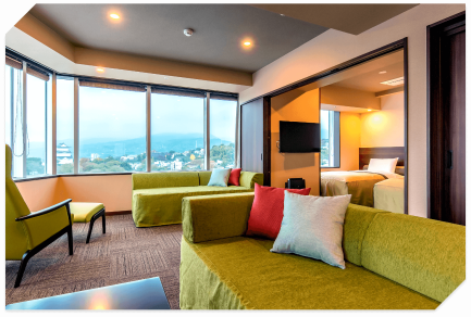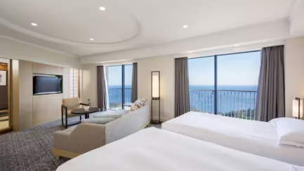 ヒルトンは相模湾を一望できる高台に建っていて、敷地に足を踏み入れた瞬間から日常とちょっと離れた贅沢感が味わえるのが魅力!家族旅行やカップルでの記念日旅行など、幅広いシーンに対応できる使い勝手の良さも人気の理由です。客室はどれも広々としていて、落ち着いたカラーのインテリアが心地よい空間を作っています。