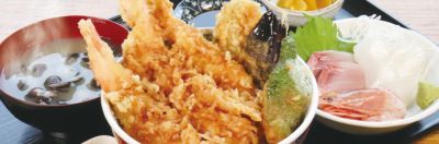 個人的おススメはDX地魚エビ天丼定食…!天丼、刺身そして名前にも入っている貝汁(貝のお味噌汁)が全て1つになった、ボリューム満点のメニューになっております!